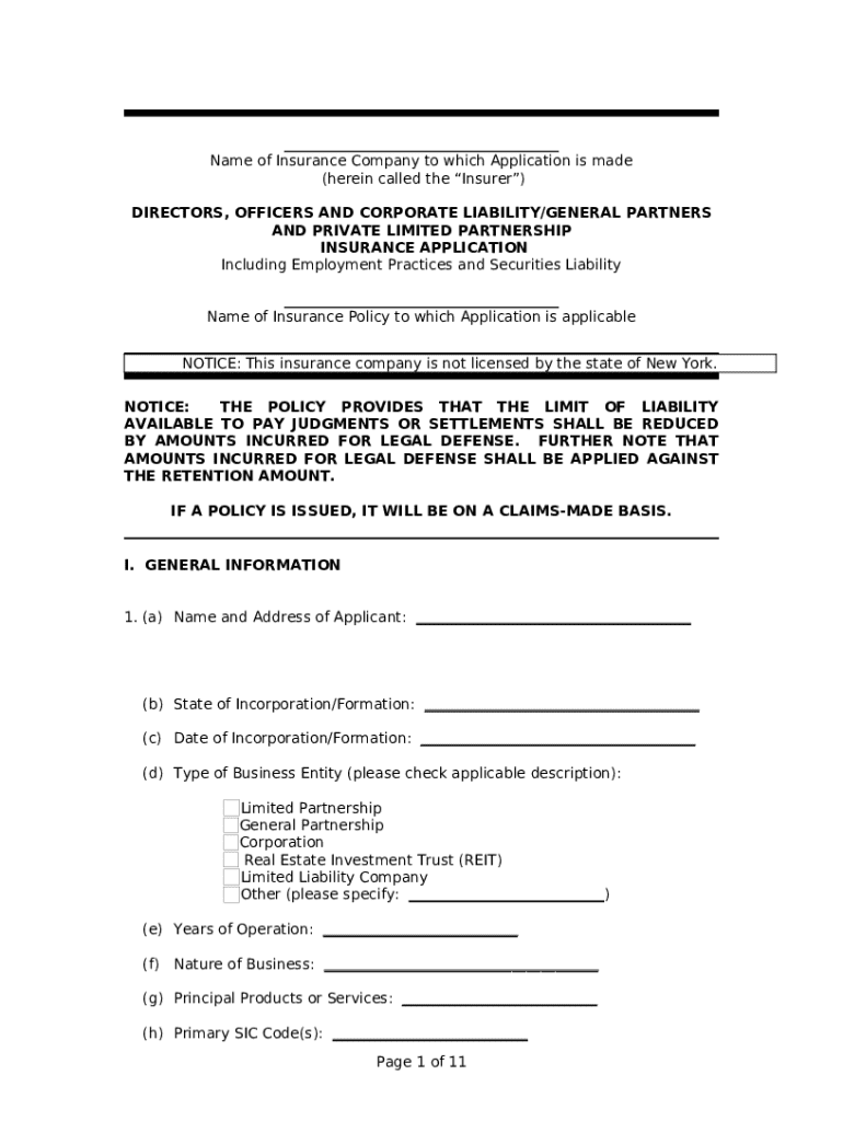 A partnership makes this application to obtain insurance coverage for directors, officers and corporate liability as well as employment practices and securities liability.