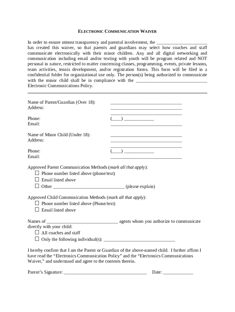 An electronic communication waiver is a document that allows parents or guardians to provide consent for certain forms of communication between their minor children and coaches or staff. This waiver ensures that both the parents are informed about and approve the communication methods used, establishing trust and transparency.