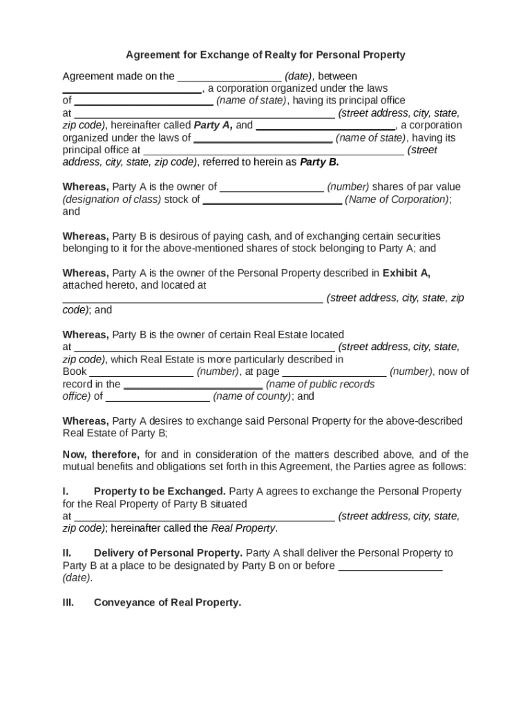 Get the free Agreement for Exchange of Realty for Personal Property template