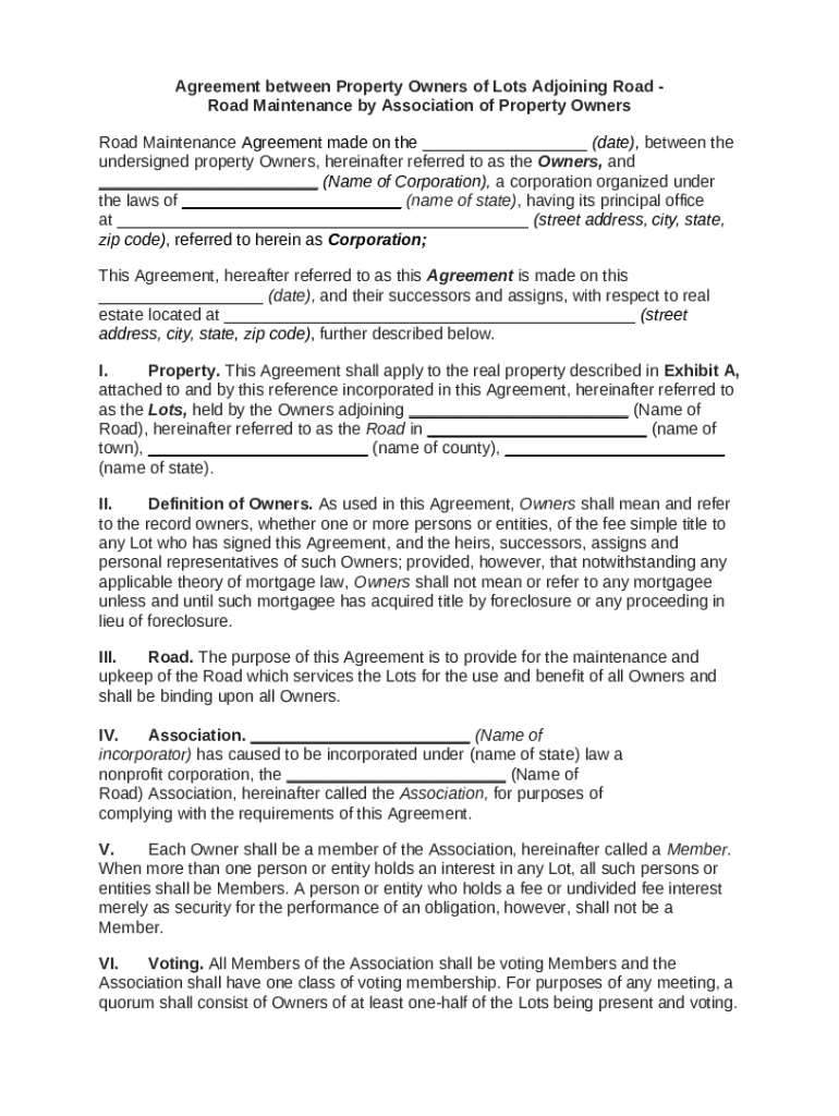 This form is an agreement between property owners of lots adjoining road - road maintenance by assocation of property owners.