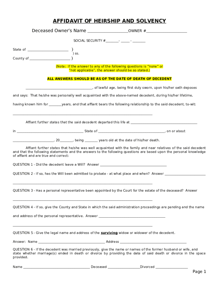 An Affidavit of Heirship is a written solemn oath that verifies the named individual is a legal heir of someone who died. Generally, the document is used if a person dies without a will and the probate
