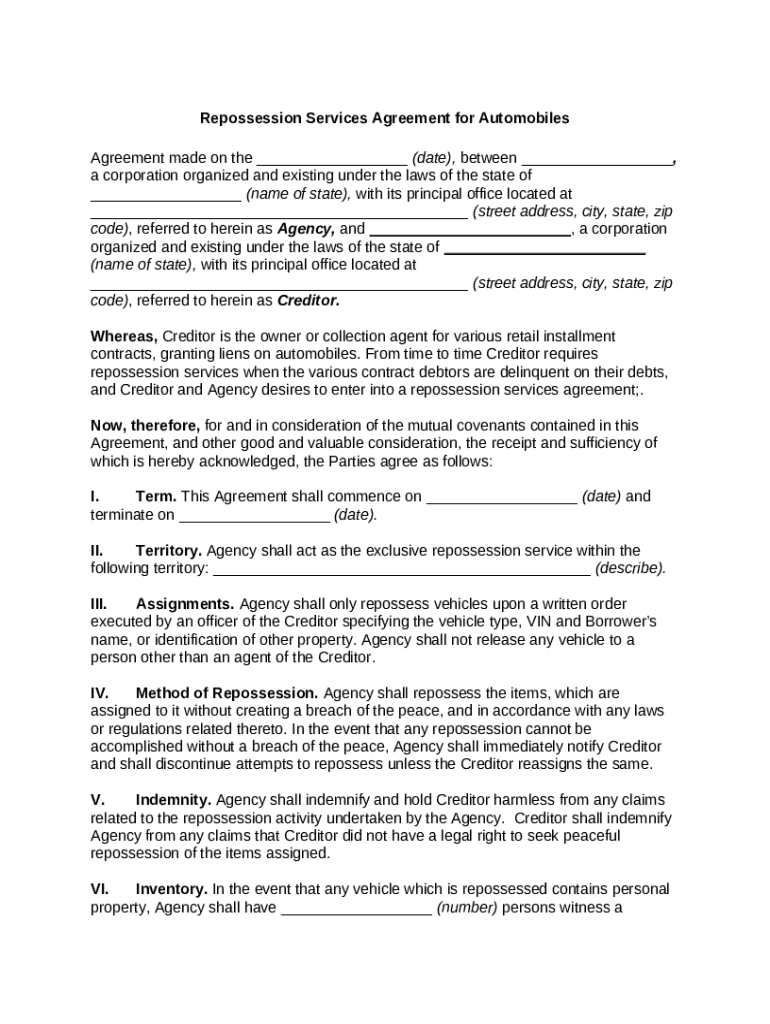 Get the free Repossession Services Agreement for Automobiles template