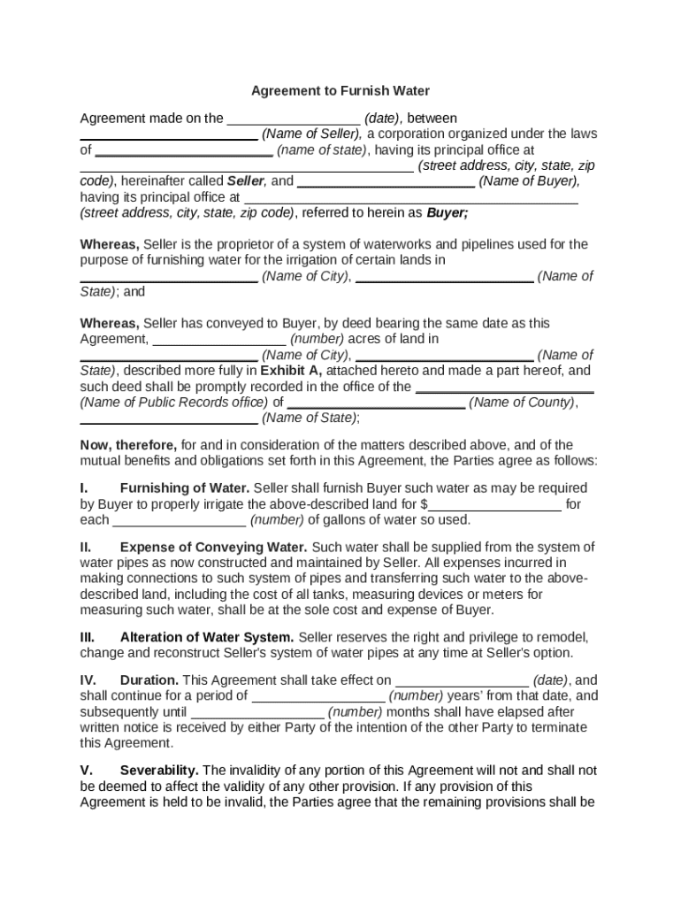 An agreement to furnish water is a legal document outlining the terms under which one party provides water to another party.