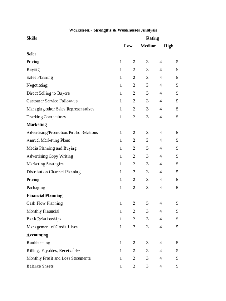 A comprehensive skills assessment is critical to deriving insights from the strengths and weaknesses worksheet. The following skill areas are essential for effective analysis: