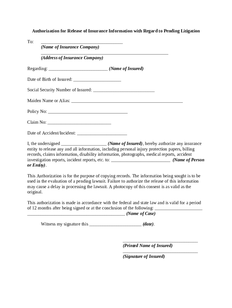 This form grants permission to an insurance company to release insurance information with regard to pending litigation