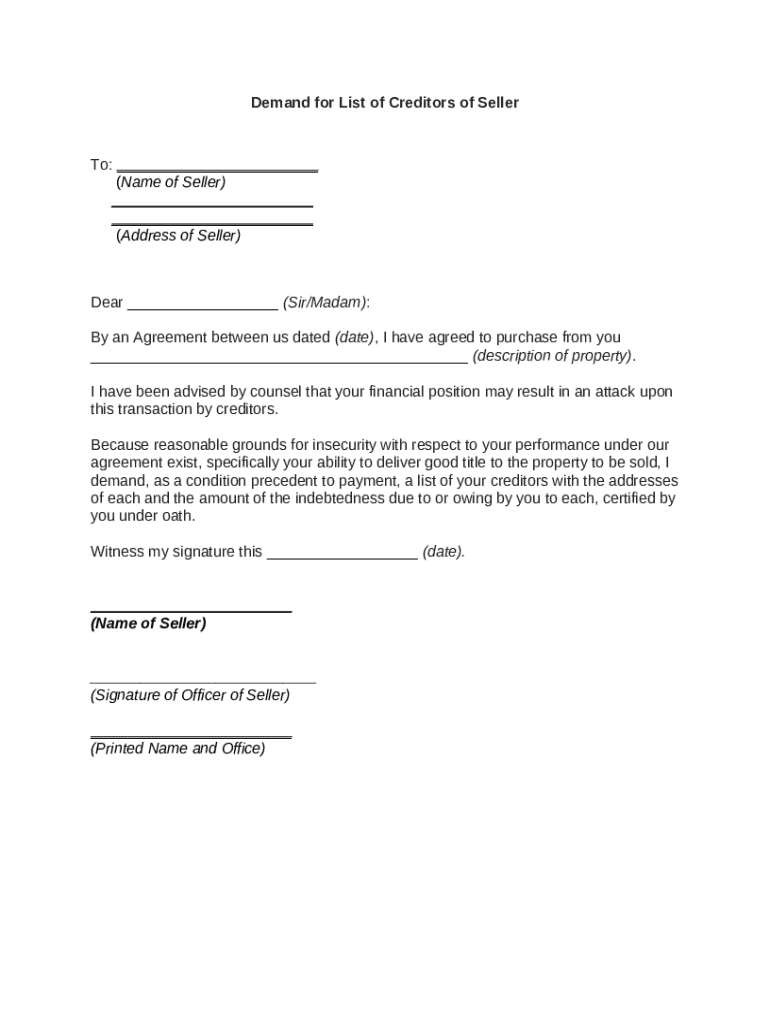 Get the free Demand for List of Creditors of Seller template