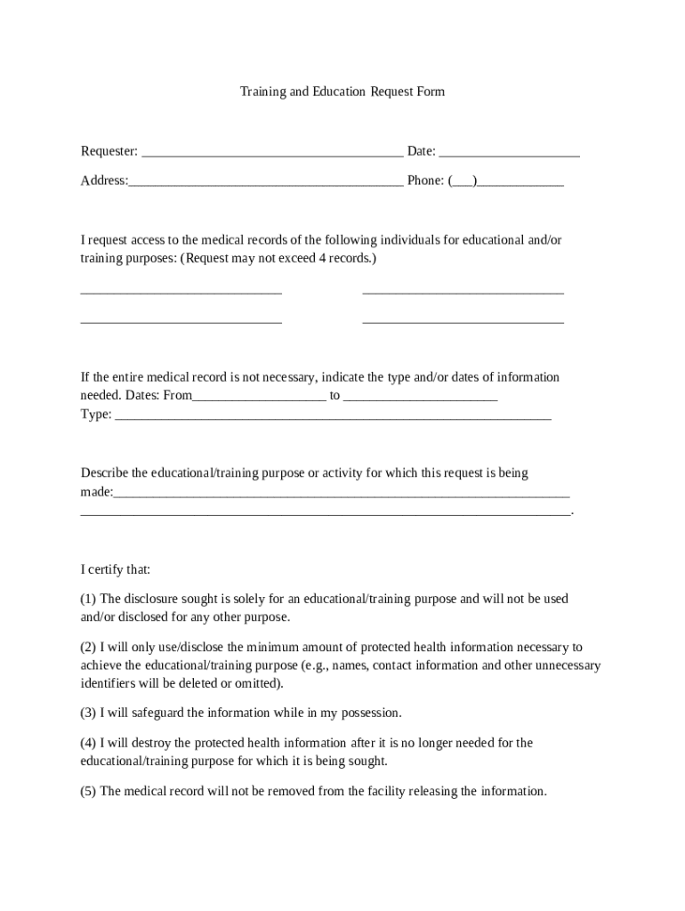 This form is to request access to the medical records of named individuals for educational and/or training purposes. The requester agrees to limitations on the use of the information and to protect