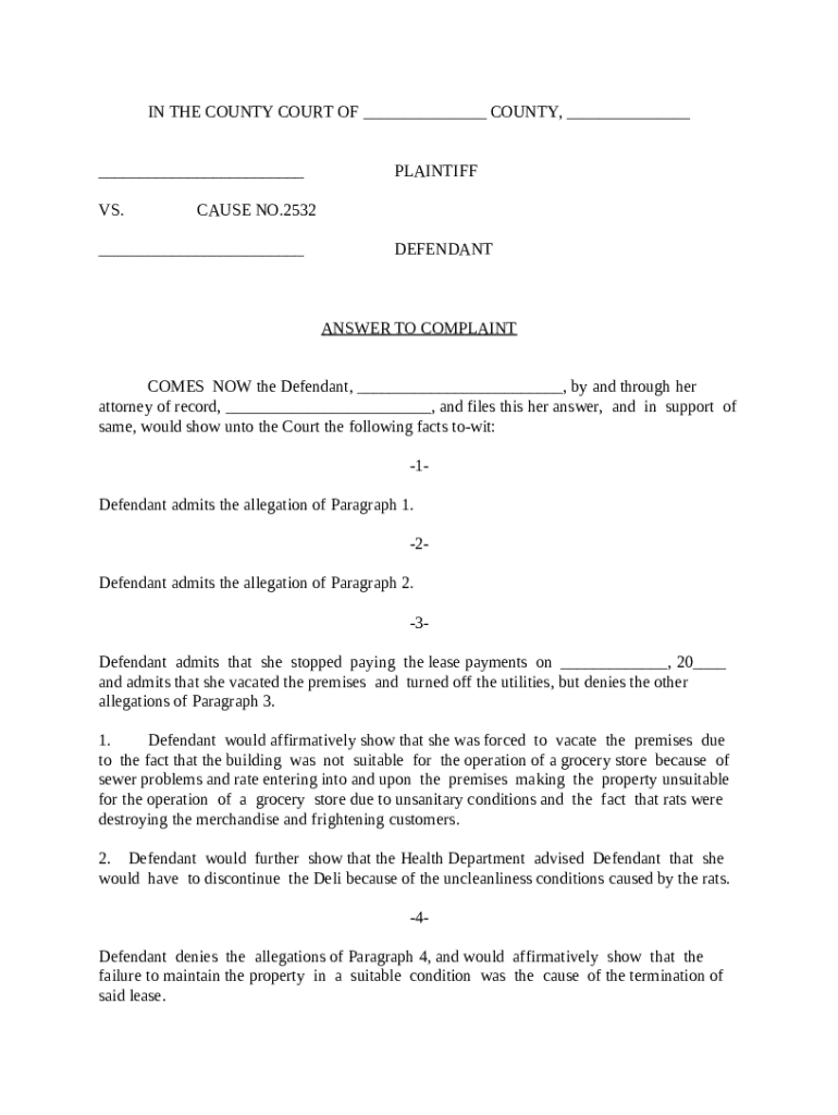 Get the free Answer to Complaint template