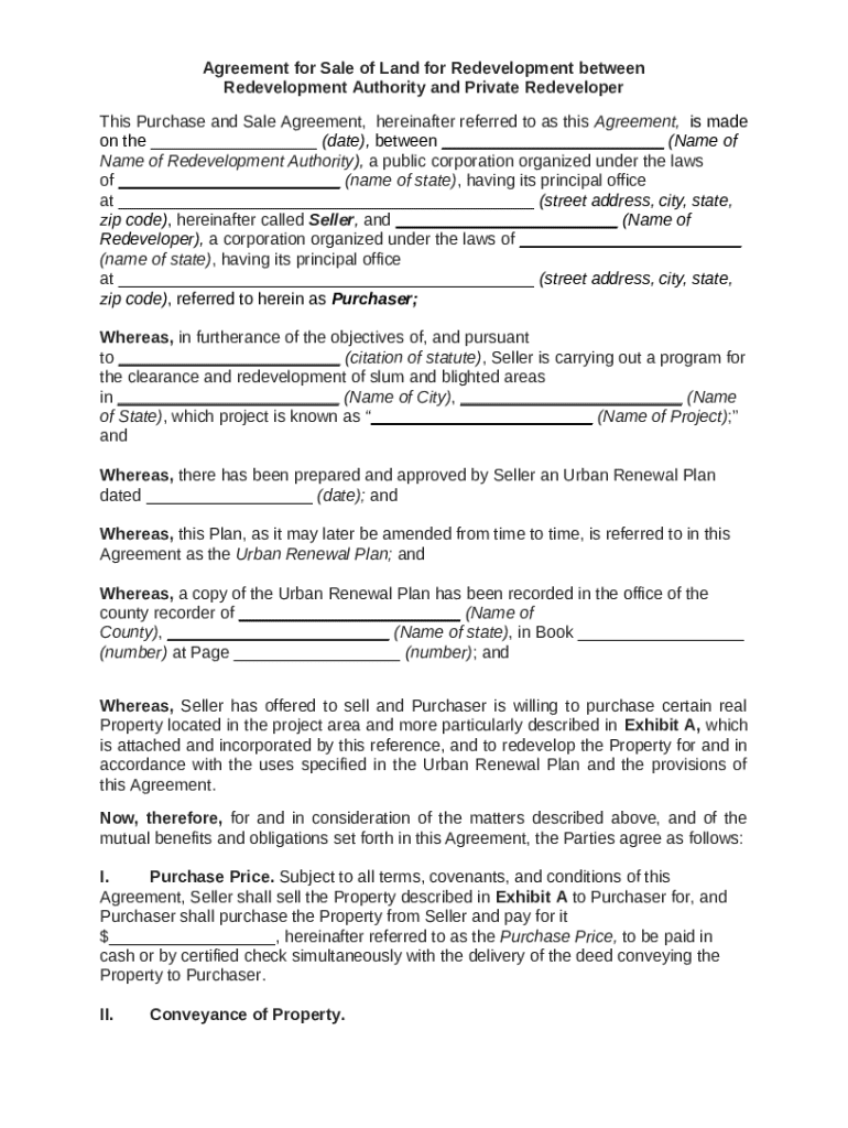 This form is an agreement for sale of land for redevelopment between redevelopment authority and private redeveloper.