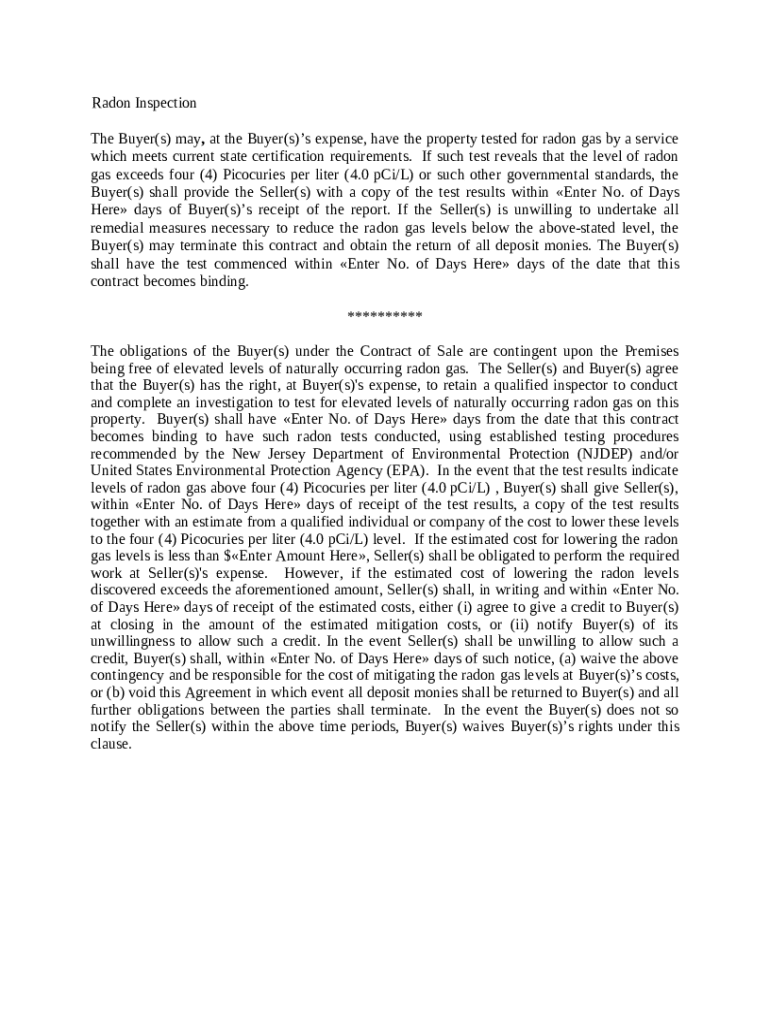 Includes clauses detailing rights to conduct radon tests and timelines for actions based on results.