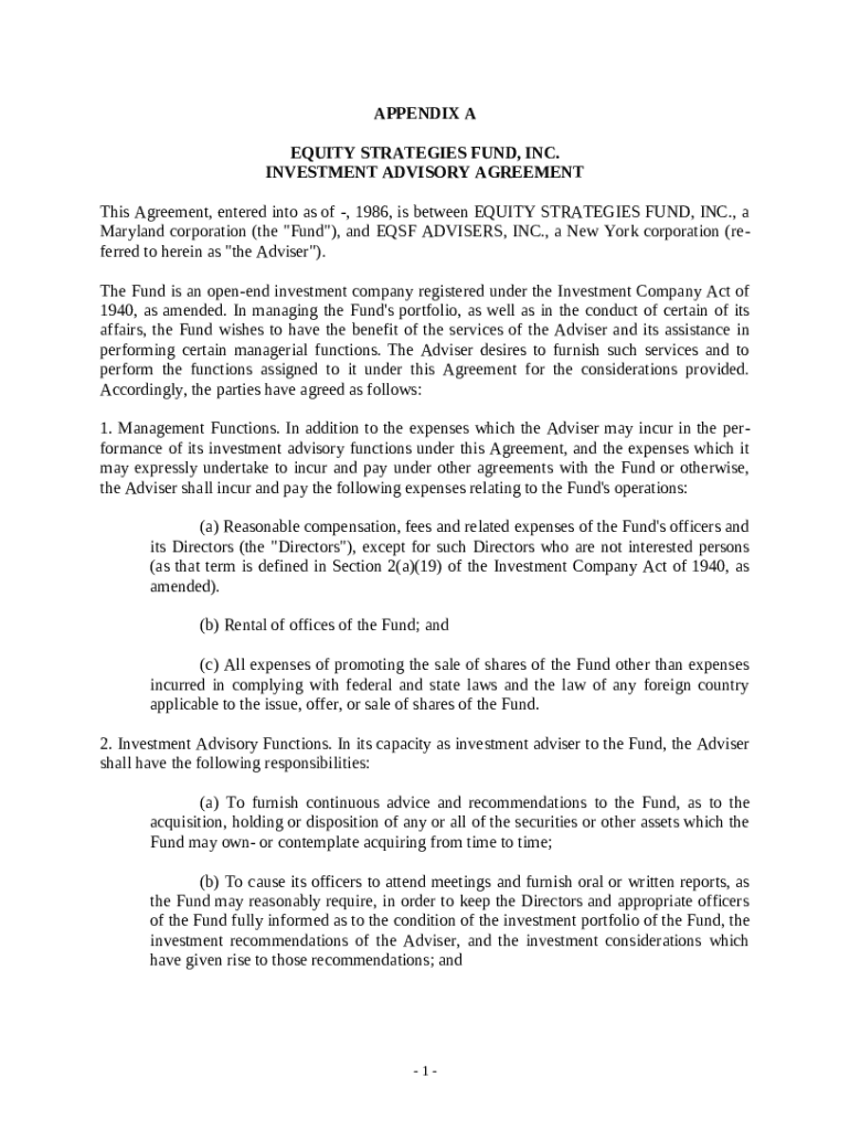 Get the free Investment Advisory Agreement of Equity Strategies Fund, Inc. and EQSF Advisors, Inc...
