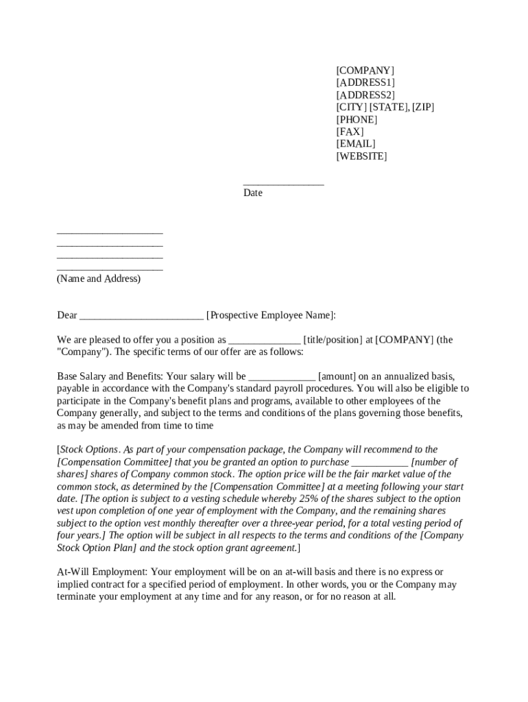 The following is a simple offer letter for an employee that is intended to create "at-will" employment. The option grant may be excluded where equity is not a part of the proposed compensation.