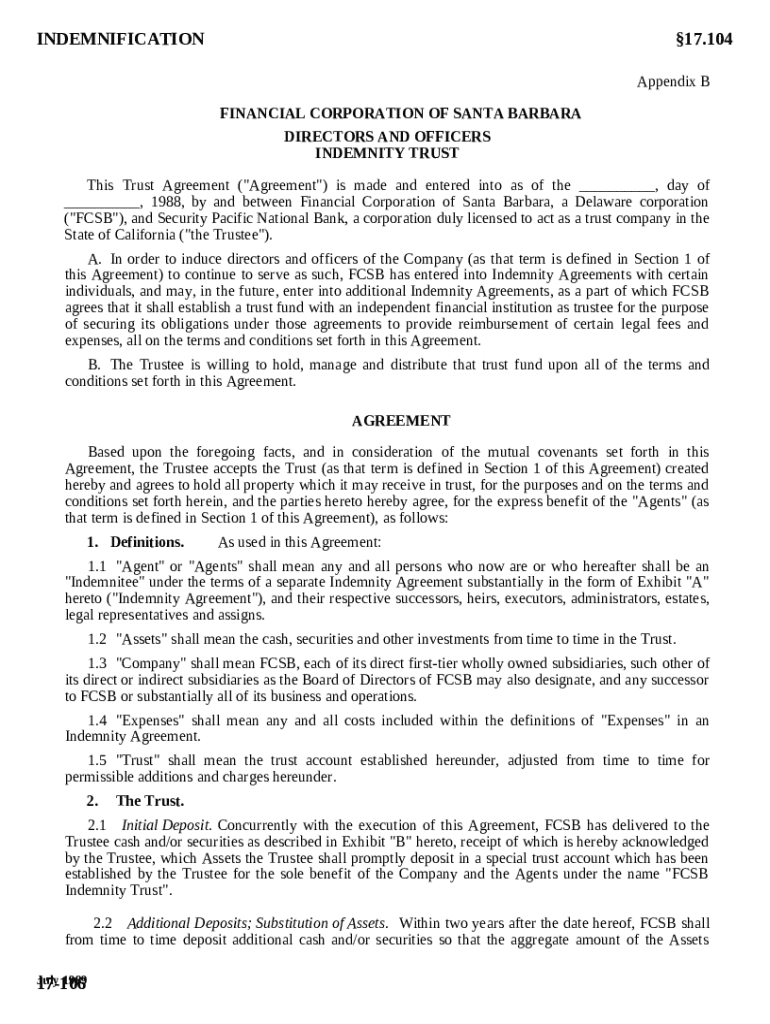 The Directors and Officers Indemnity Trust Agreement can serve to protect the assets of the company on behalf of the indemnified individuals. Reviewing Appendix B of this agreement outlines key roles, where the Trustee is tasked with managing the assets and ensuring compliance with the obligations of both the Financial Corporation and the Trustee.
