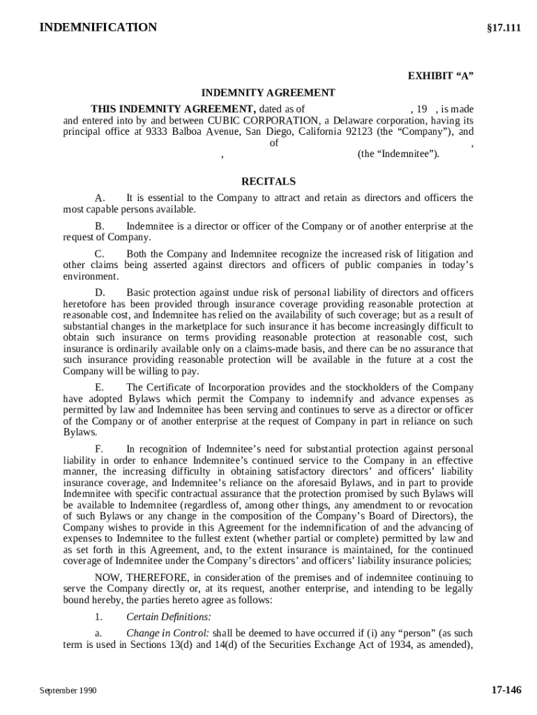 An indemnity agreement is a legally binding contract designed to protect a corporation's directors and officers from liability arising from their corporate duties. These agreements are essential in corporate governance because they mitigate personal financial risks associated with legal actions. Specifically, indemnity agreements are often utilized in scenarios such as lawsuits or claims involving breach of fiduciary duty, ensuring that key individuals can perform their responsibilities without fear of personal loss.
