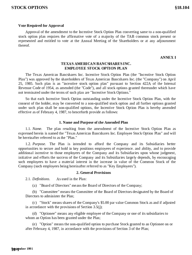 Get the free Employee Stock Option Plan of Texas American Bancshares, Inc. template