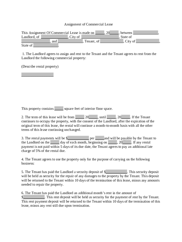 In this assignment, the landlord and tenant comes to terms for the rental of commercial property of a certain amount of interior floor space for a stated term. Security deposit and an additional month's