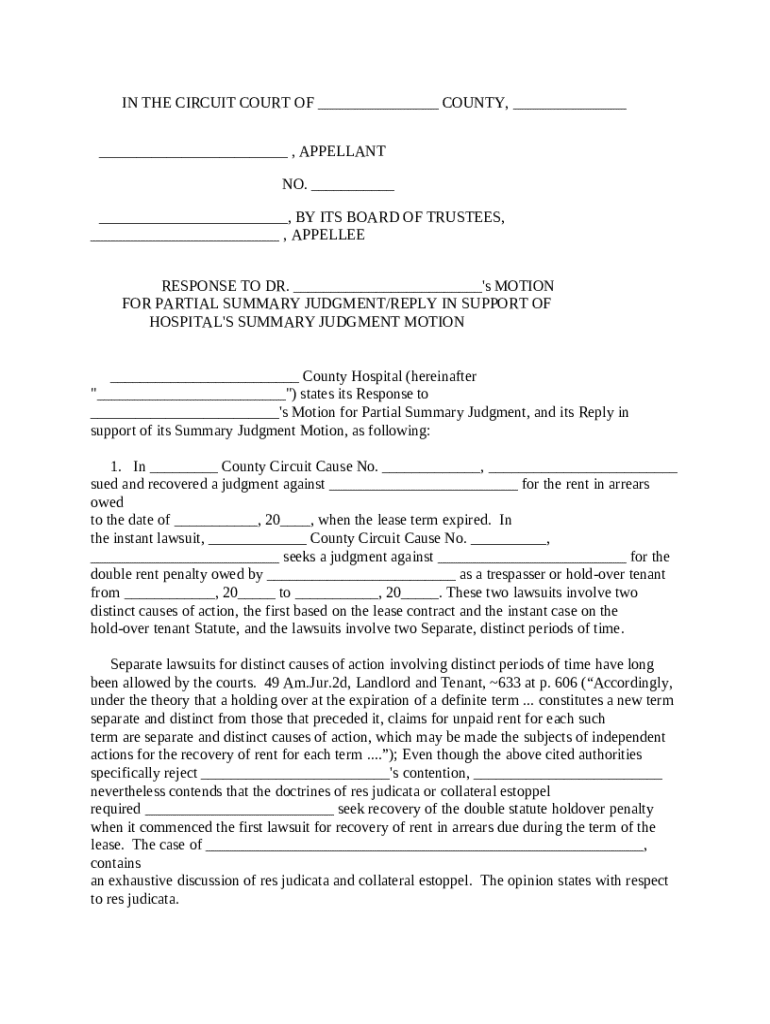 Get the free Response to Motion for Partial Summary Judgment in Support of Hospital's Summary Jud...