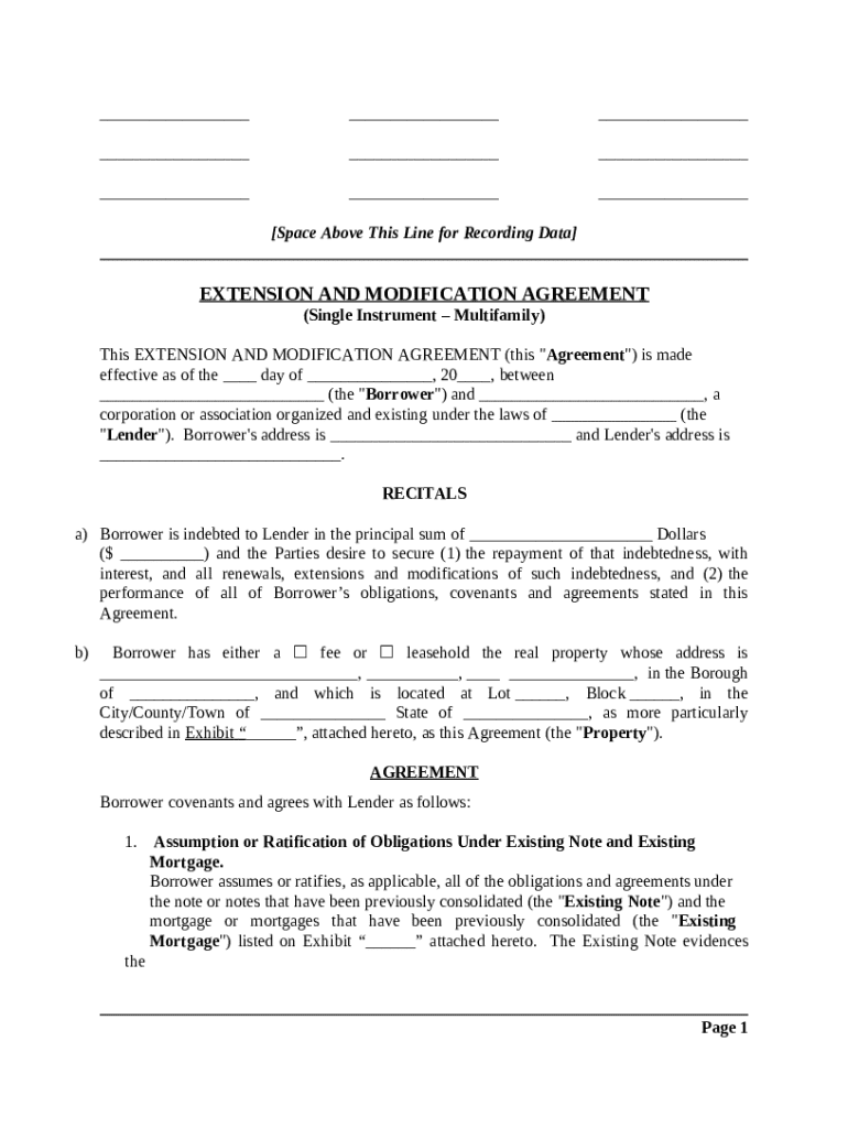 A loan modification agreement and extension for an existing loan that either has modifications to the agreement or if the loan agreement has been extended.