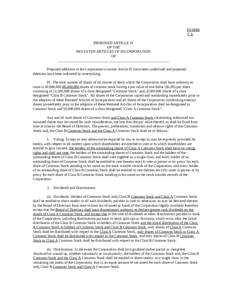This sample form, a detailed Proposed Article IV of the Restated Articles of Incorporation document, is a model for use in corporate matters. The language is easily adapted to fit your specific circumstances.