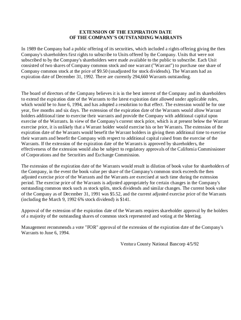 Get the free Extension of the expiration date of the company's outstanding warrants template