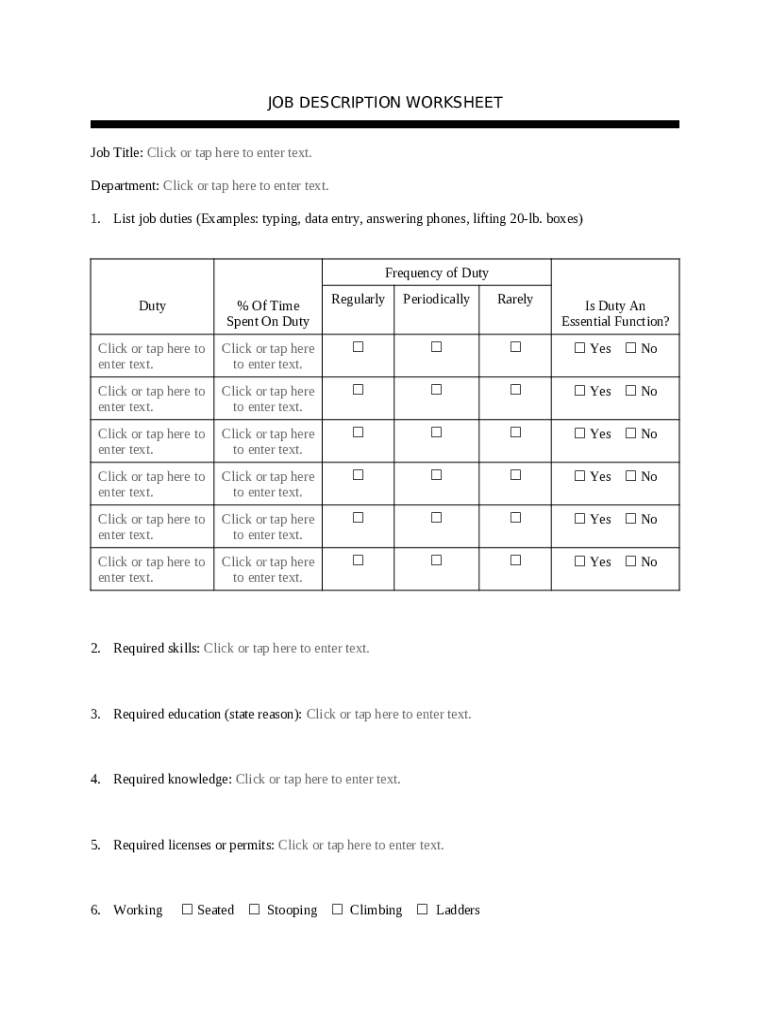 A job description worksheet is a document that outlines the responsibilities, requirements, and qualifications for a specific job position.
