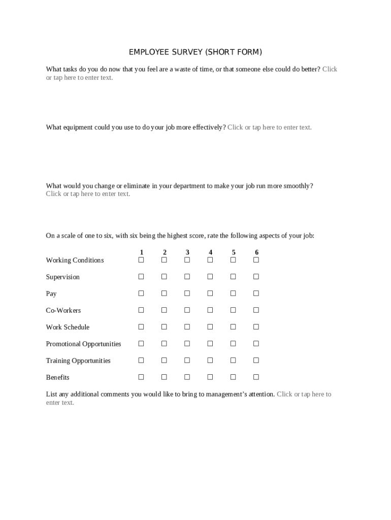 An employee survey short form is a condensed tool designed to gather feedback from employees regarding their experiences, satisfaction levels, and insights about the workplace. Such surveys are crucial in understanding employee morale and organizational culture, enabling management to make informed decisions.