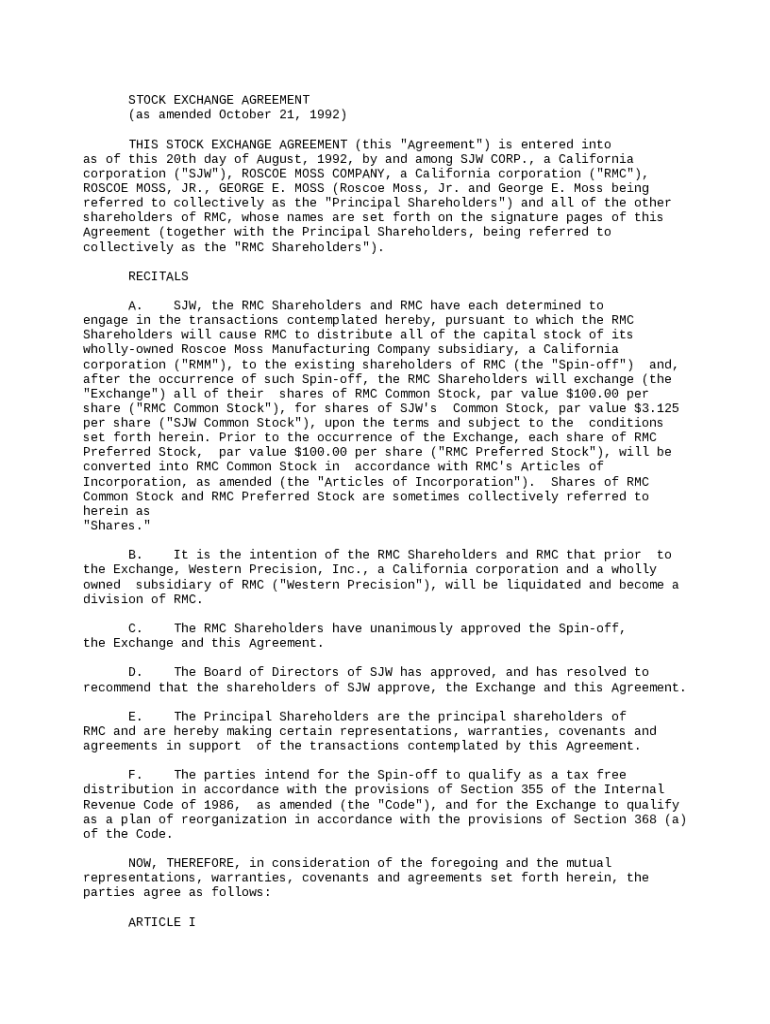 Get the free Stock Exchange Agreement by SJW Corp, Roscoe Moss Company, and RMC Shareholders - Te...