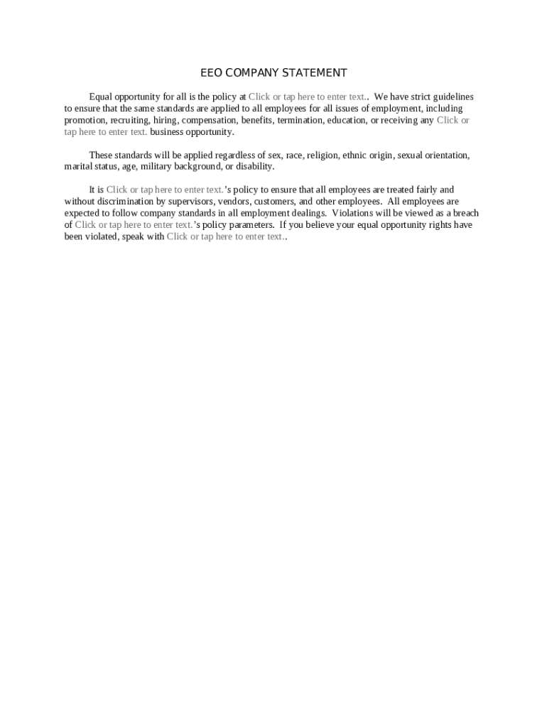 An EEO company statement is a formal document that outlines an organization's commitment to equal employment opportunity and prohibits discrimination in the workplace.