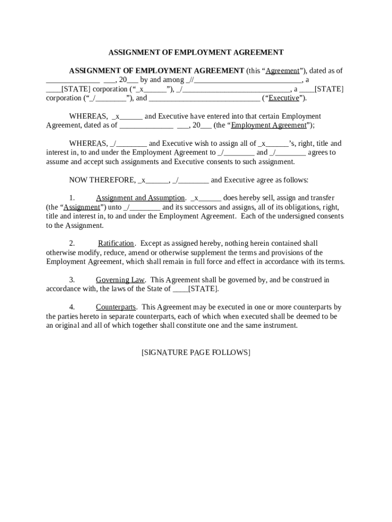 An assignment of employment agreement is a legal document that transfers rights and obligations from one employee to another regarding employment terms.