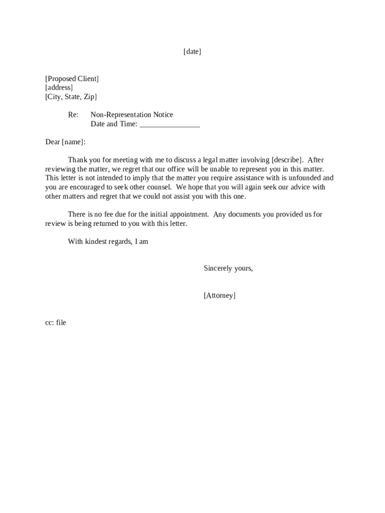 Get the free Letter to Proposed Client - Non-Representation Letter template