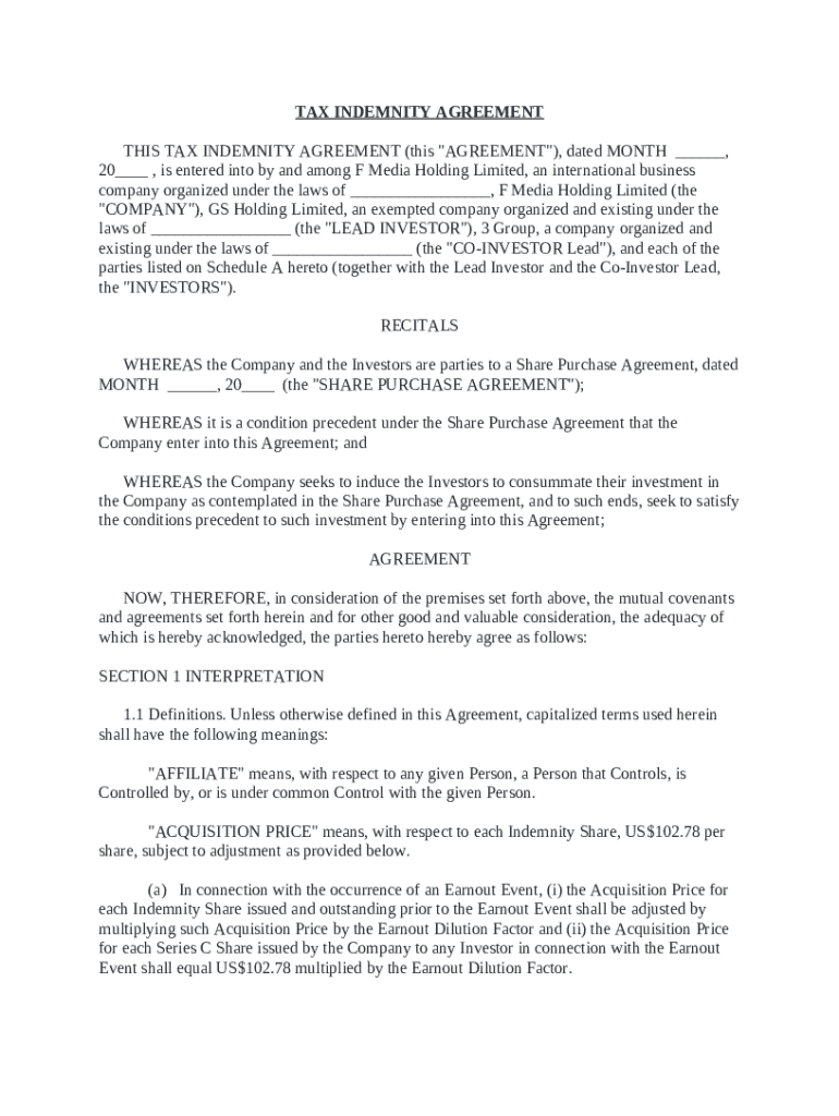 This is a sample Tax Indemnity Agreement. Indemnification, also referred to as indemnity, is an undertaking by one party (the indemnifying party) to compensate the other party (the indemnified party)