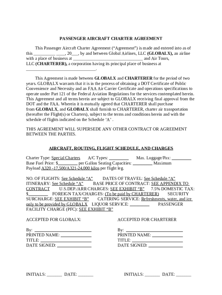 A passenger aircraft charter agreement is a contractual document that outlines the terms under which a charter flight will be conducted. This agreement is crucial in the aviation industry as it sets clear expectations and responsibilities between the parties involved, primarily between GLOBALX, the charter operator, and the CHARTERER. Understanding this document forms the basis for a successful charter experience.