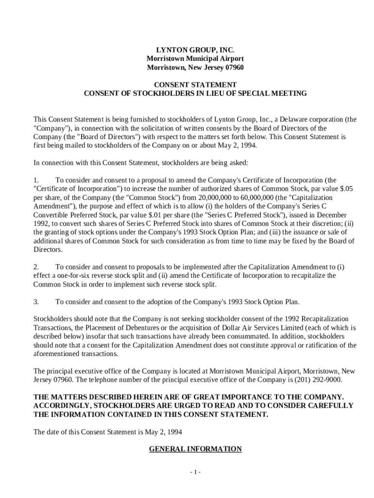 This is a Consent Statement to be used by corporation across the United States. This particular Consent Statement asks for the Stockholder's consent in lieu of calling a special meeting.