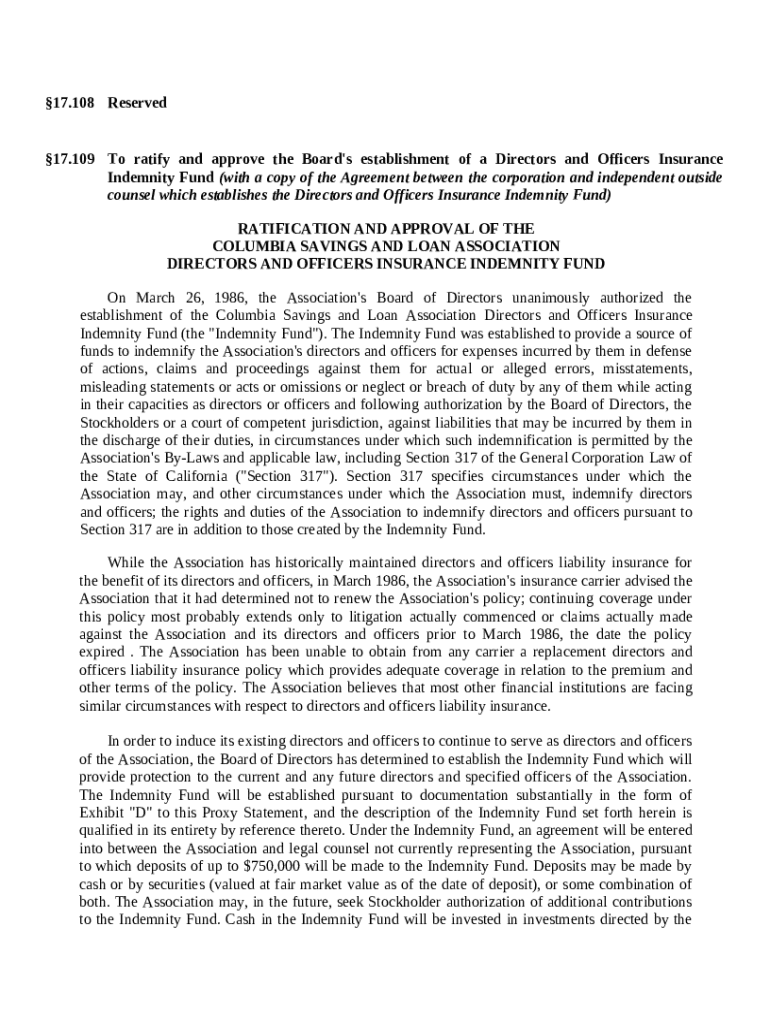 Get the free Ratification and approval of directors and officers insurance indemnity fund with co...