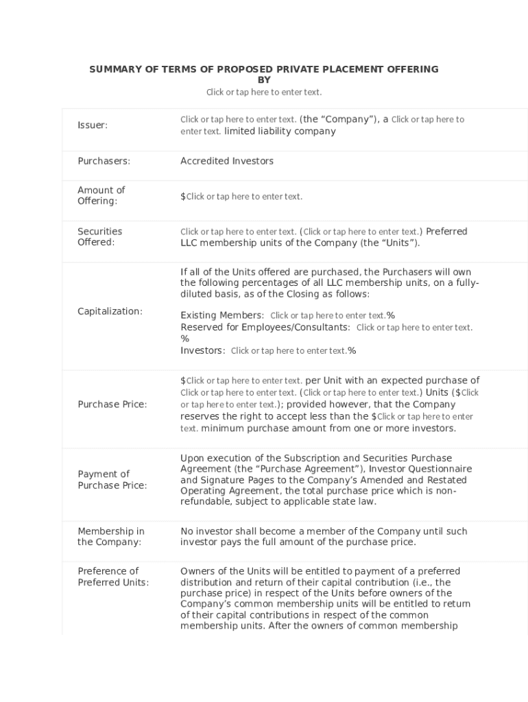 Get the free Summary of Terms of Proposed Private Placement Offering template