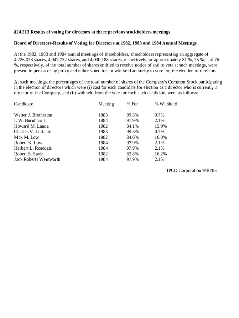 Get the free Results of voting for directors at three previous stockholders meetings template