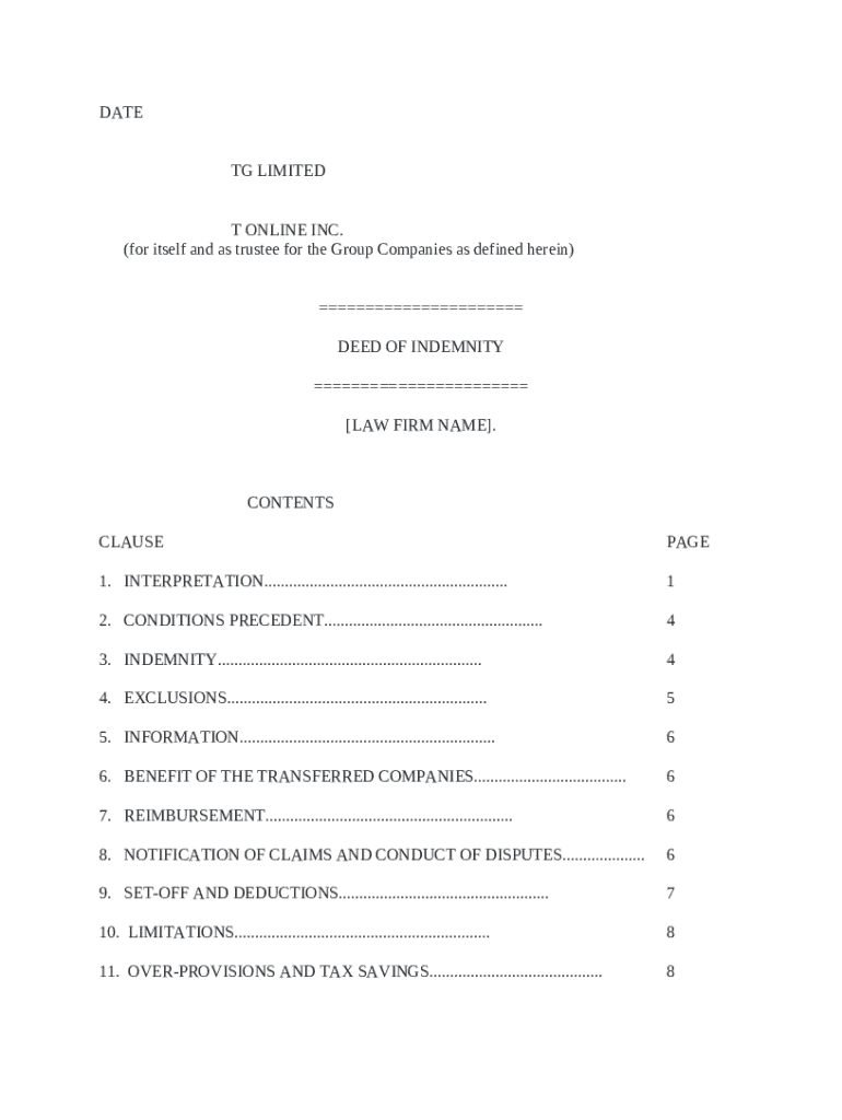 Get the free Deed of Indemnity template