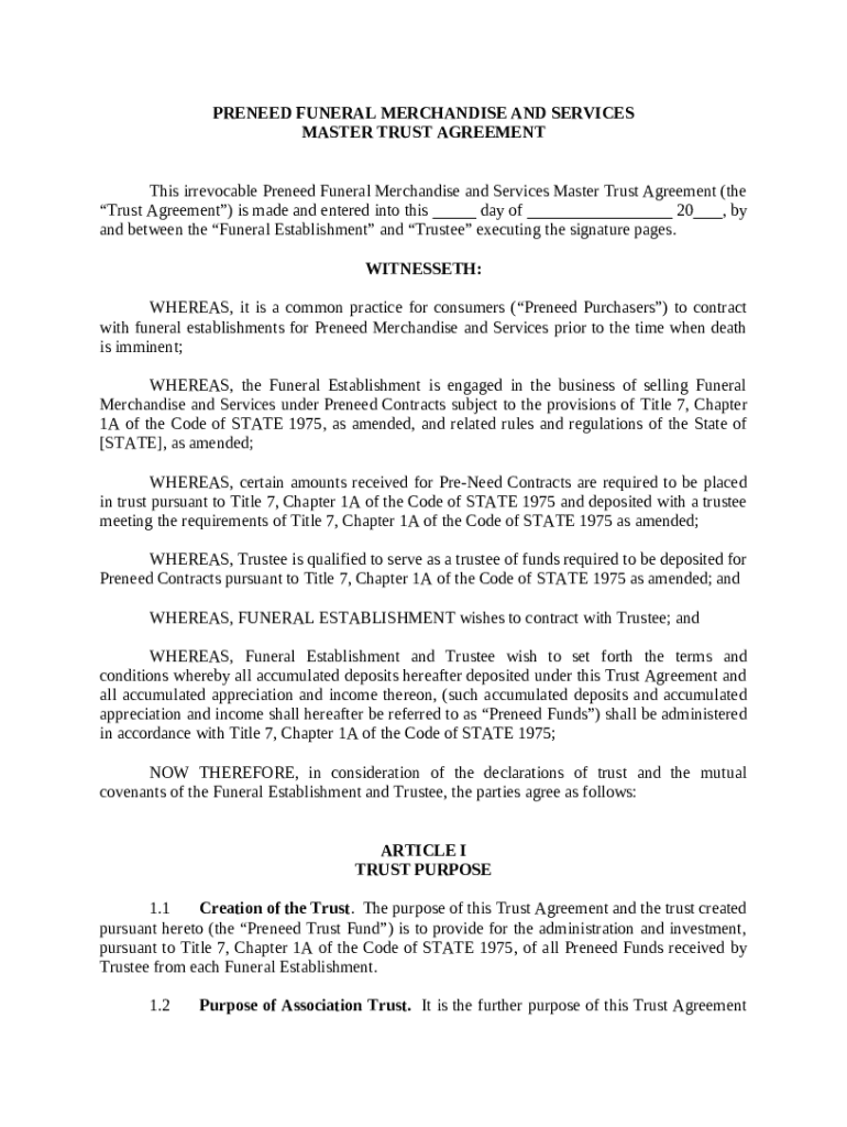 Get the free Preneed Funeral Merchandise and Services Master Trust Agreement template
