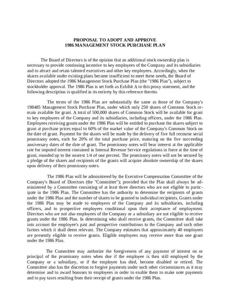 Get the free Proposal to adopt and approve management stock purchase plan template