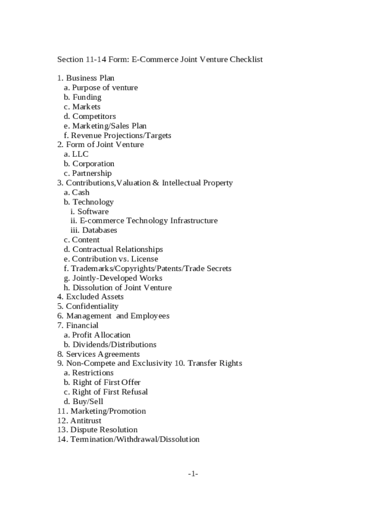 This is a model contract form for use in business settings, an E-Commerce Joint Venture Checklist. Available for download in Word format.