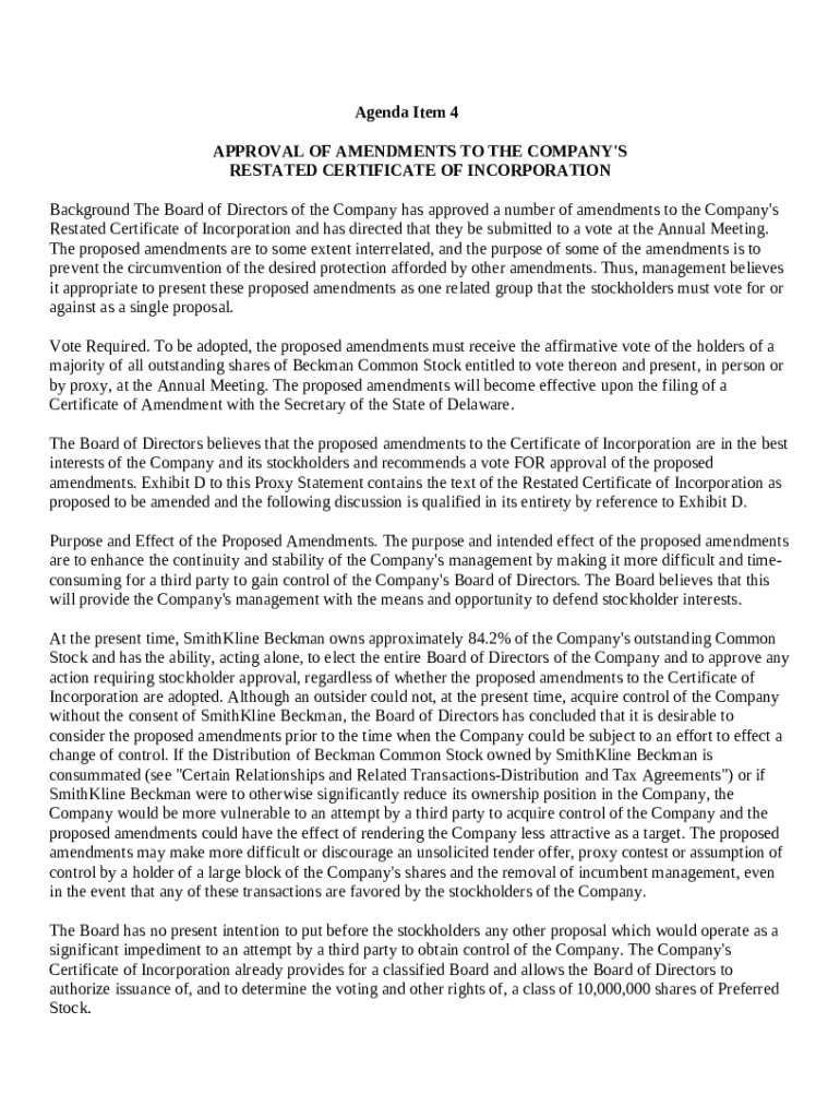 Get the free Approval of Amendments to Restated Certificate of Incorporation with amendment template