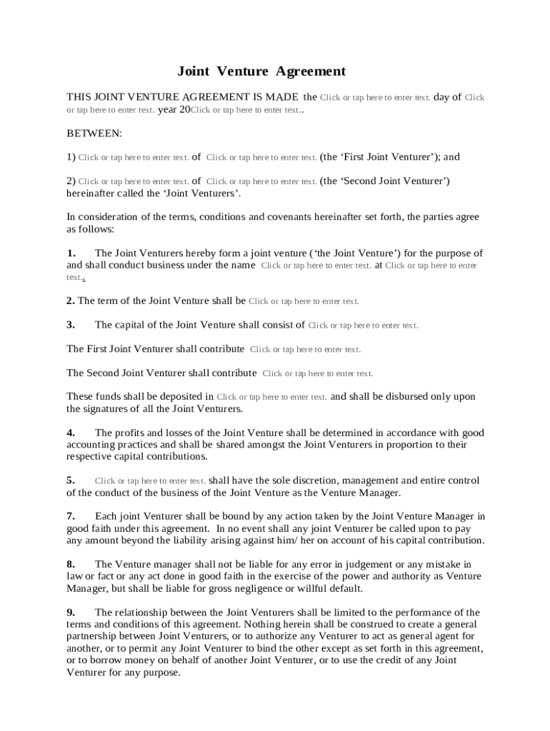A basic joint venture agreement is a legal document outlining the terms and conditions under which two or more parties collaborate on a business project.