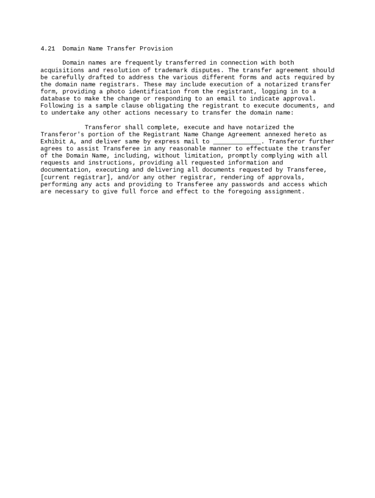 This form is a Domain Name Transfer Provision for a transfer agreement, either as part of an acquisition, settlement of a trademark dispute, or similar matter, that obligates the registrant of the