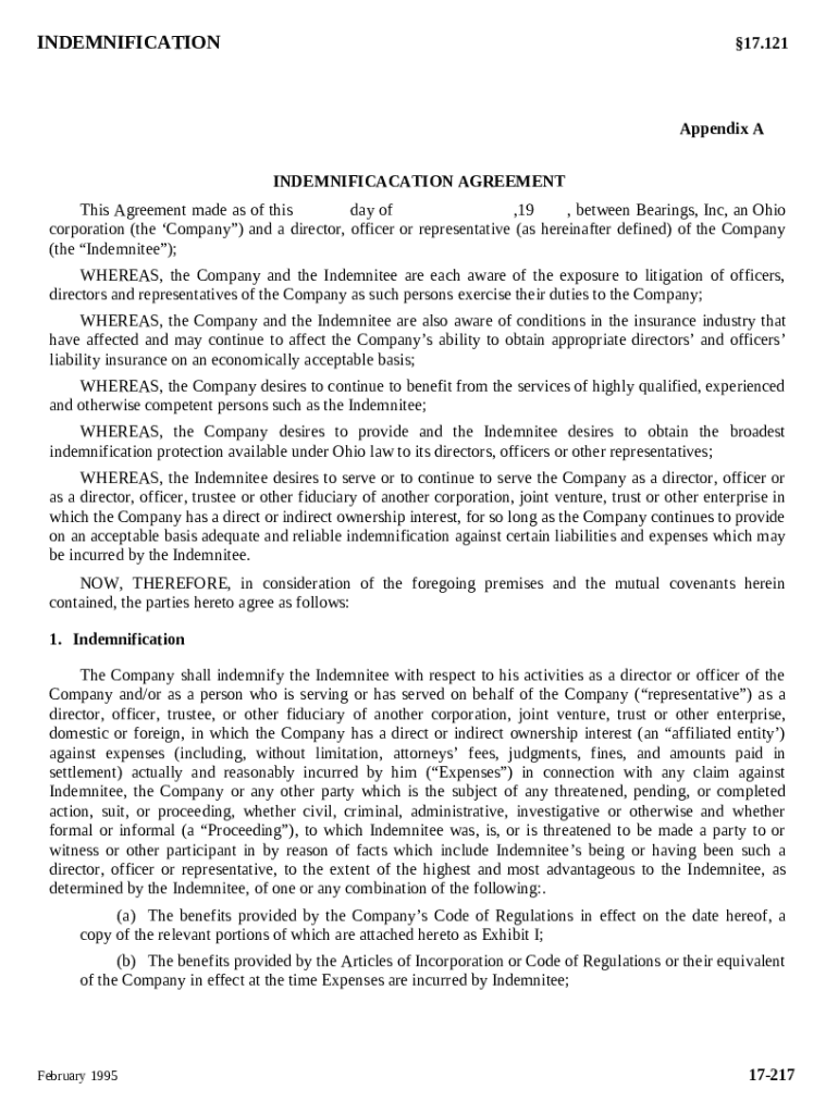 17-217 17-217 . . . Indemnification Agreement providing that (i) in event of change in control, corporation shall establish Escrow Reserve of $2,000,000 as security for its obligations under Indemnification
