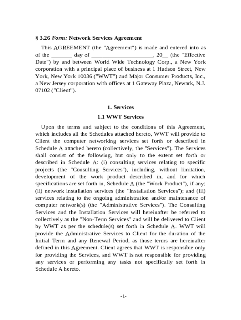 A network services agreement is a contract that outlines the terms and conditions governing the provision of network services between a service provider and a client.