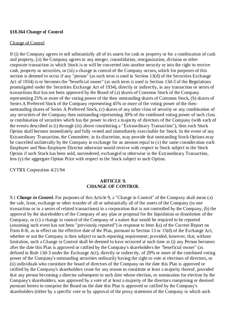 A change of control document outlines the terms and conditions under which control of a company or organization is transferred from one party to another.