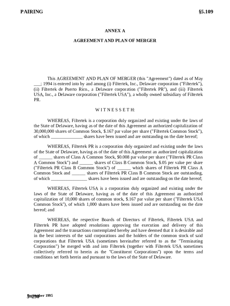 Get the free Agreement and Plan of Merger by Filtertek, Inc., Filtertek de Puerto Rico, and Filte...