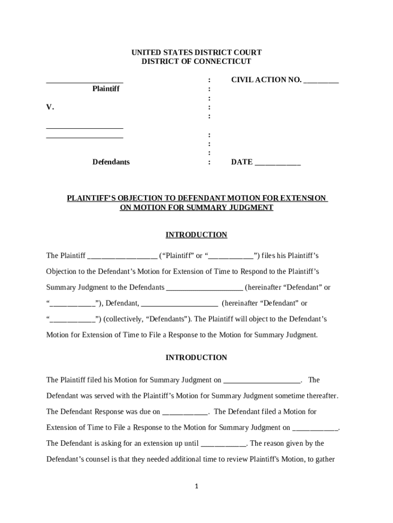 Get the free Plaintiff's Objection to Extension on Motion for Summary Judgment template