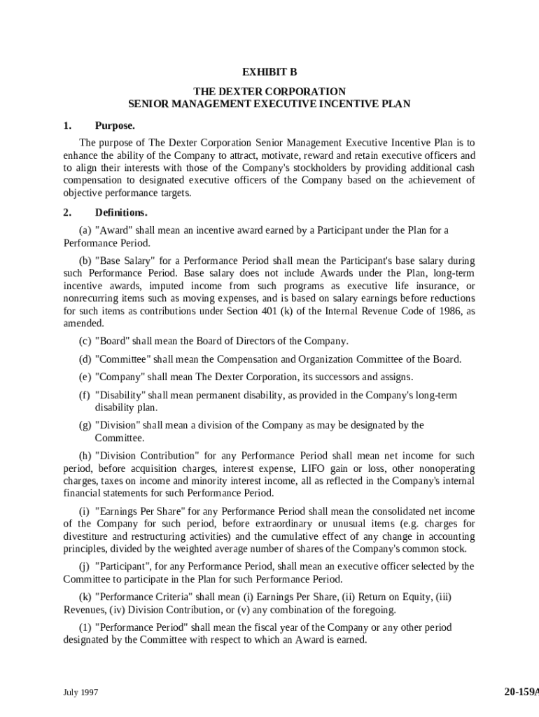 20-157 20-157 . . . Senior Management Executive Incentive Plan under which Compensation Committee designates and establishes (a) individuals who will be participants in Plan during performance period,