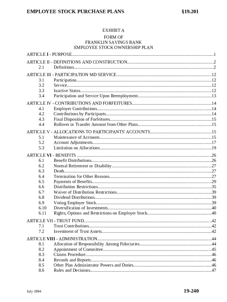 The ESOP form consists of multiple articles that delineate various aspects of the plan.